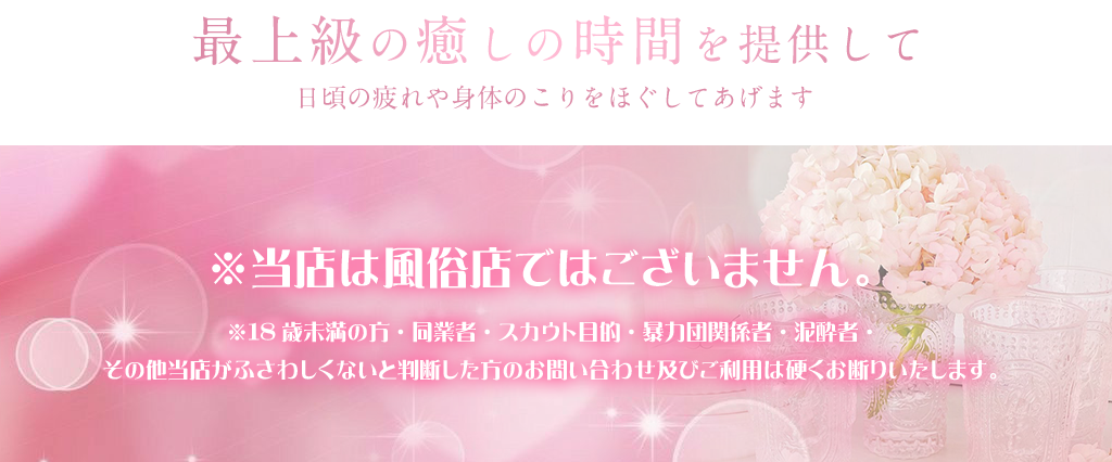 癒されるマッサージと気軽なコミュニケーションが楽しめる当リラクゼーション。当店は単にマッサージをして身体を癒すだけではなく、疲れた心を含めて最高にリラックスでき癒しマッサージを体験して頂けるよう日々努力しております。日ごろの疲れを綺麗なセラピストがほぐします。ゆったりと甘いひと時をお過ごしください。